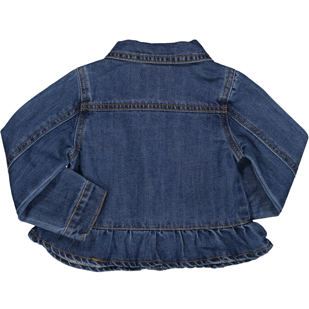 GIUBBOTTO IN JEANS CON TASCHE APPLICATE SU PETTO E ROMANTICO VOULANT AL FONDO. APERTURA FRONTALE CON BOTTONI.