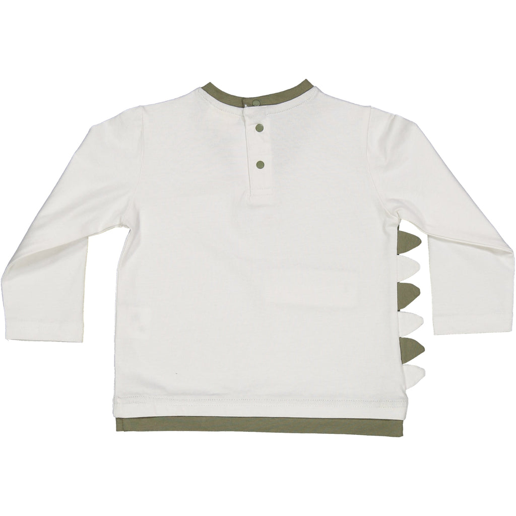 TSHIRT IN JERSEY DI COTONE 100% PER IL MASSIMO COMFORT SULLA PELLE. GRAFICA DINOSAURO SUL FIANCO CON CRESTE IN 3D CHE FUORIESCONO DAL CAPO. FINTO SCOLLO A V IN COLORE CONTRASTO. APERTURA CON BOTTONCINI AUTOMATICI SUL DIETRO