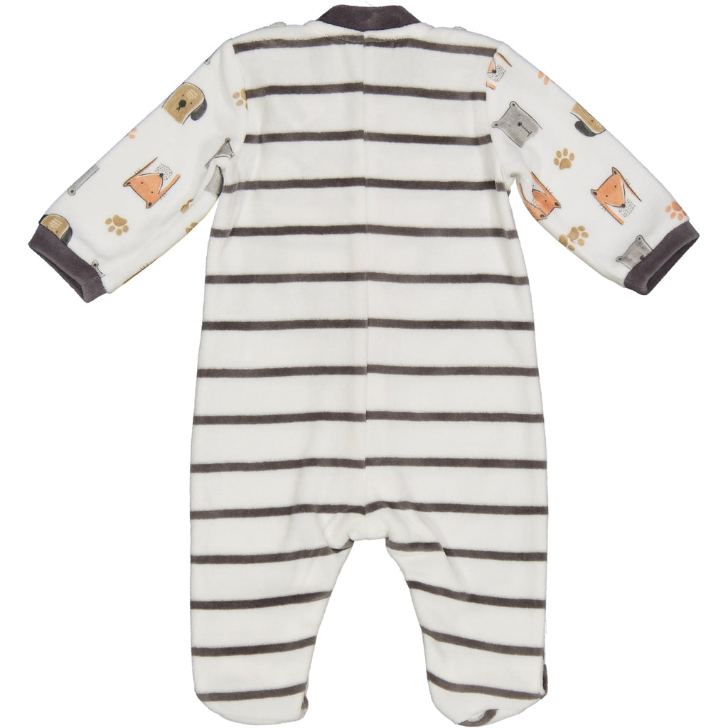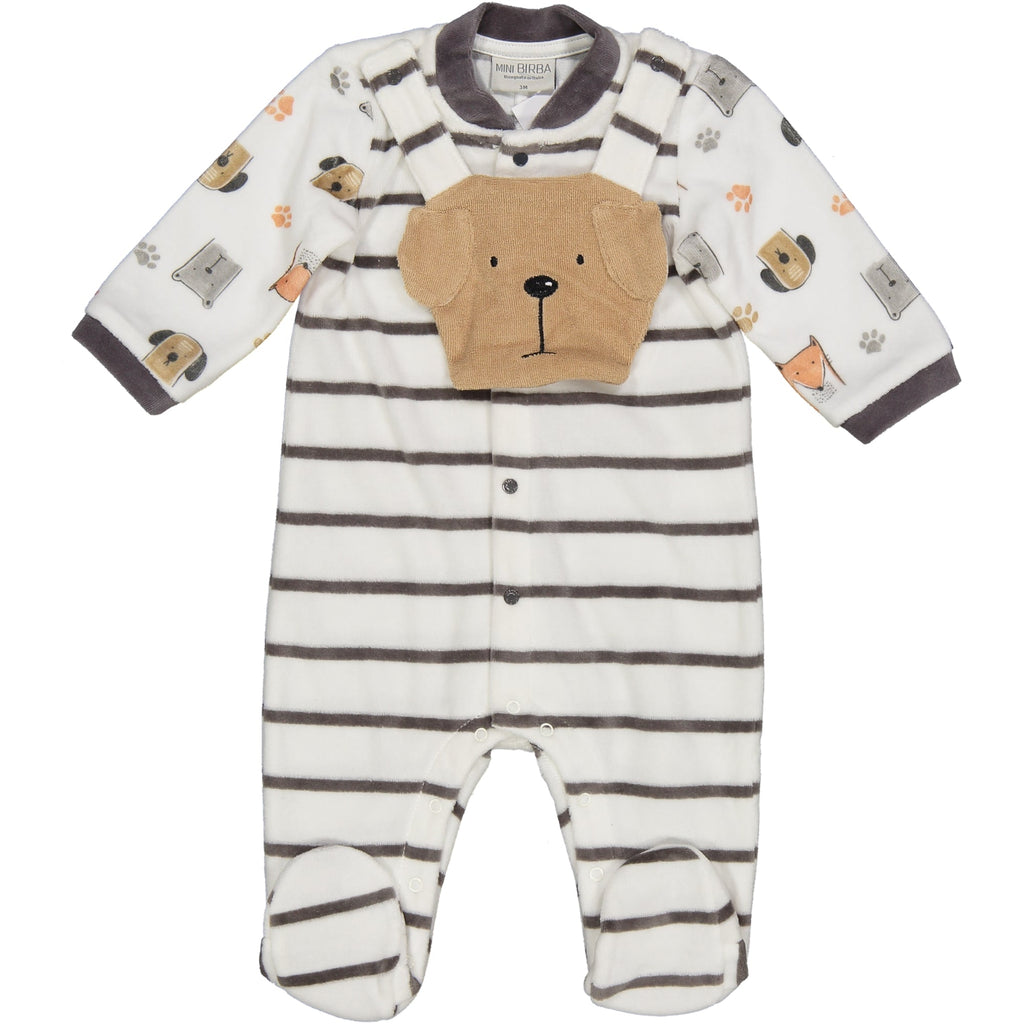 TUTINA IN CINIGLIA IN FANTASIA COMBINATE, RIGATA E PUPPIES. DETTAGLIO BAVAGLIO PER BAVETTE IN SPUGNA A FORMA DI CAGNOLINO. APERTURA SUL DAVANTI E NELL'ENTROGAMBA CON BOTTONCINI AUTOMATICI. LA TUTINA VIENE VENDUTA ALL'INTERNO DELLA SCATOLA CONIGLIETTO