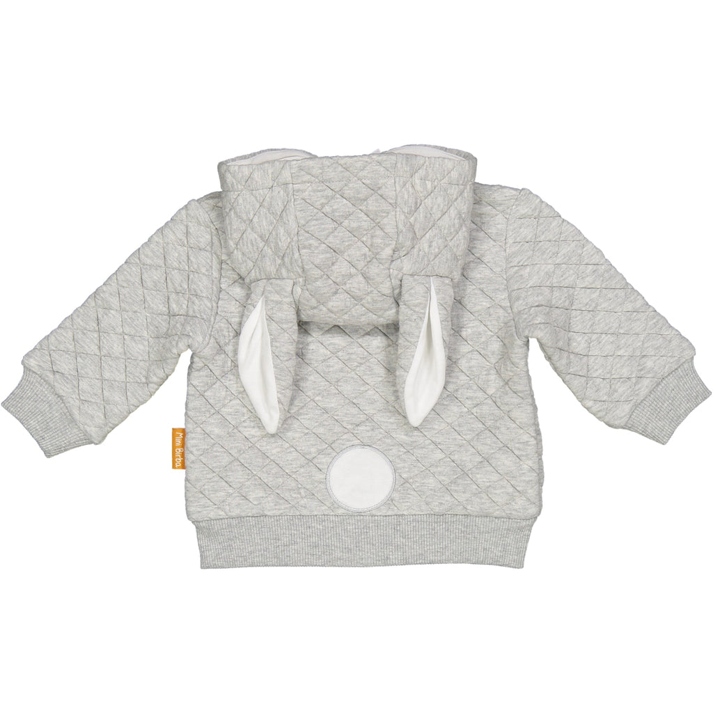 CARDIGAN IN JERSEY TRAPUNTATO, ORECCHIE SUL CAPPUCCIO A FORMA DI CONIGLIETTO. INTERNO CAPPUCCIO IN FANTASIA CAROTE. CODINA SUL DIETRO IN APPLICAZIONE. ETICHETTA BANDIERINA PERSONALIZZATA SUL FIANCO