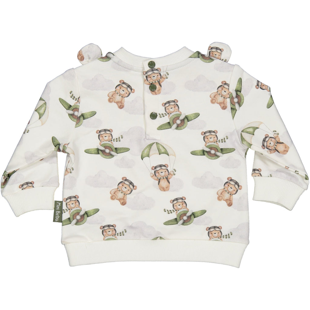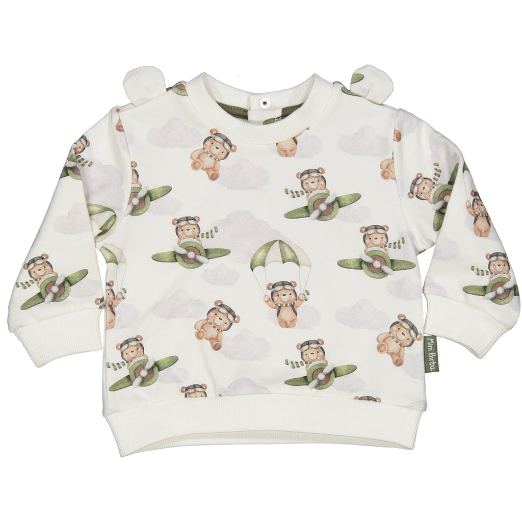 MAGLIA GIROCOLLO IN FELPA DI COTONE STRETCH GARZATA INTERNAMENTE PER IL MASSIMO CALORE SULLA PELLE. FANTASIA ORSETTI AVIATORI. DETTAGLIO ORECCHIE ORSETTO SULLE SPALLE. APERTURA SUL DIETRO CON BOTTONCINI AUTOMATICI PER FACILITARNE L'INDOSSO. ETICHETTA