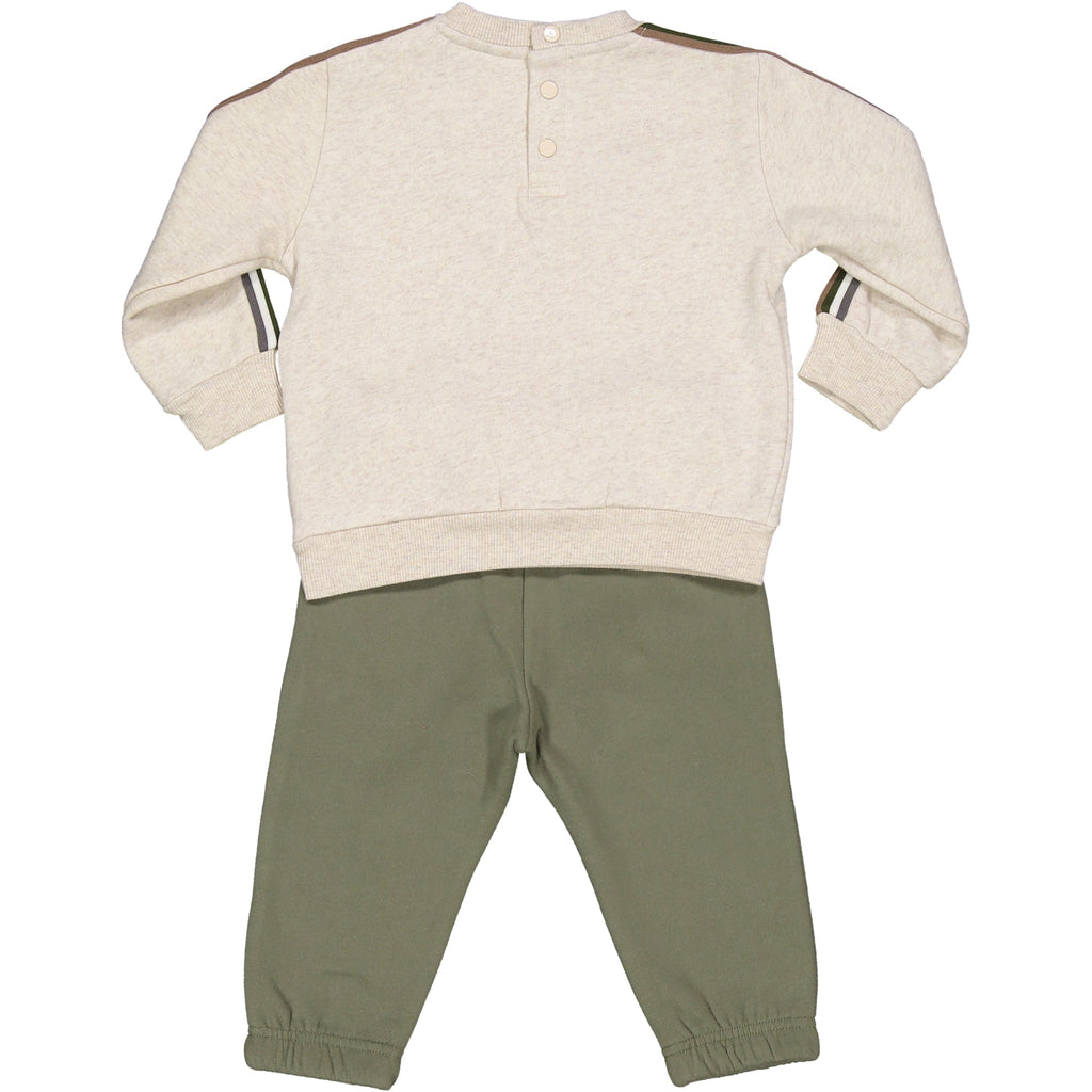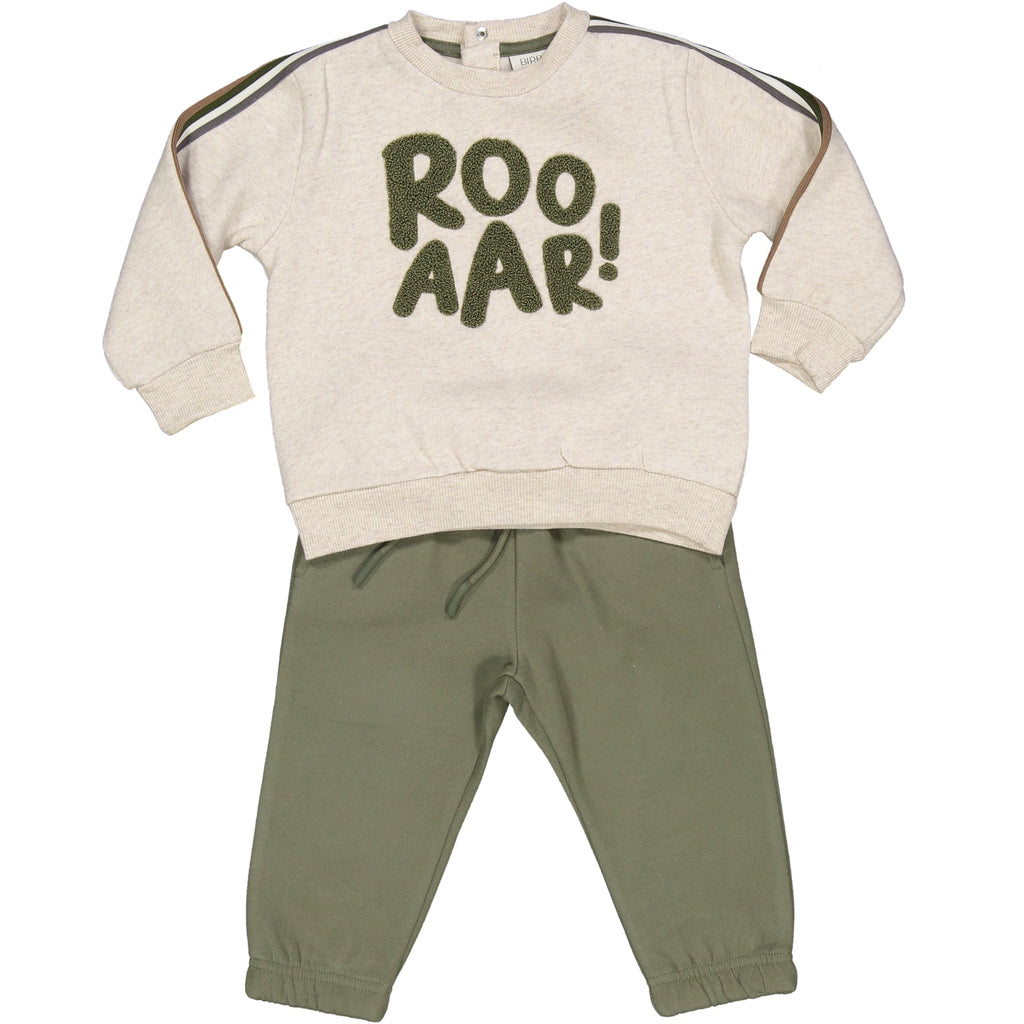 COMPLETO IN FELPA DI COTONE 100% GARZATA INTERMENTE PER GARANTIRE IL MASSIMO CALORE SULLA PELLE. MAGLIA GIROCOLLO CON BANDE SULLE MANICHE E RICAMO PUNTO SPUGNA SUL DAVANTI, APERTA SUL DIETRO CON BOTTONCINI AUTOMATICI. PANTALONE CON VITA E FONDO GAMBE