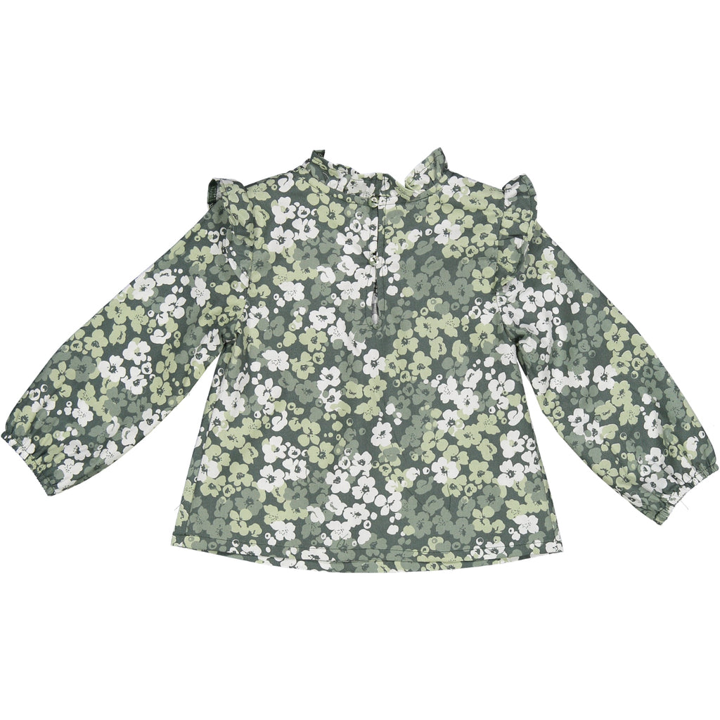 BLUSA IN CALDA E MORBIDA FLANELLA IN FANTASIA FLOREALE. MODELLO CON ROUCHES INTORNO AL COLLO E SU MANICHE, APERTURA SUL DIETRO CON GOCCIA