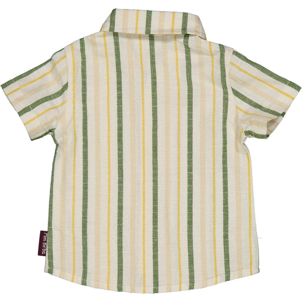 CAMICIA IN MISTO LINO FANTASIA RIGATA. BOTTONCINI EFFETO FINTO OSSO PER APERTURA FRONTALE. CON ETICHETTA BANDIERINA PERSONALIZZATA INSERITA NEL FIANCO.