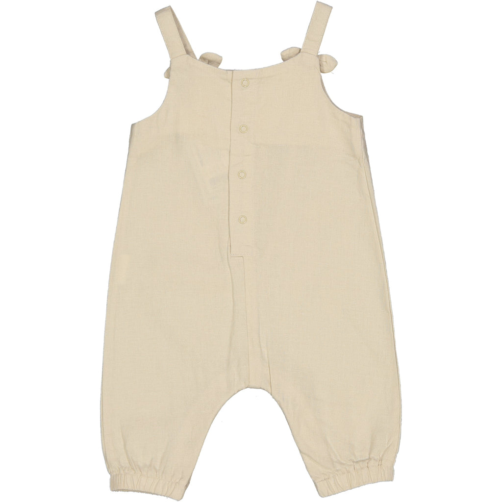 TUTA LUNGA IN TESSUTO MISTO LINO CON DETTAGLIO FIOCCHI SULLE SPALLE. CON ELASTICO A CAVIGLIA E COMODA APERTUTA ENTROGAMBE