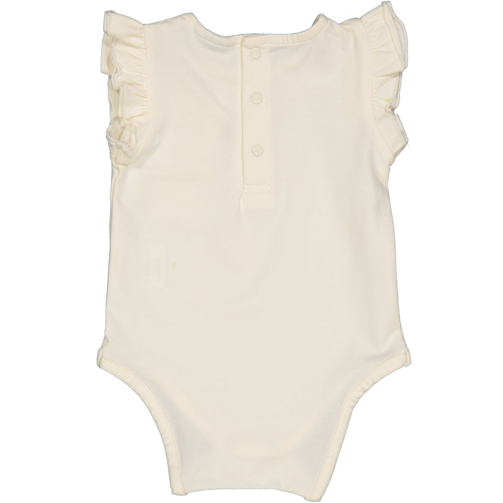 BODY IN JERSEY DI COTONE STRETCH CON SROMANTICI VOULANT A GIROMANICA. CUORE STAMPATO SUL DAVANTI CON DOLCI APINE RICAMATE. APERTURA CON BOTTONCINI SUL RETRO E NELL'ENTROGAMBA